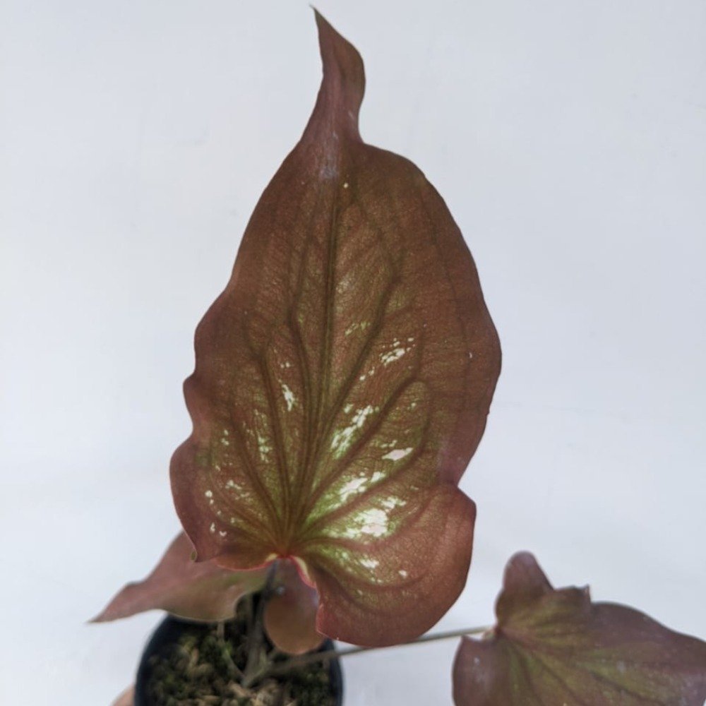 Caladium Black Scorpion. Tanaman ini sangat cantik, warnanya coklat cenderung gelap dengan bentuk seperti wayang. Simpan di tempat yang teduh ( 50% pencahayaan ) dan keladi ini menyukai media yang lembab.