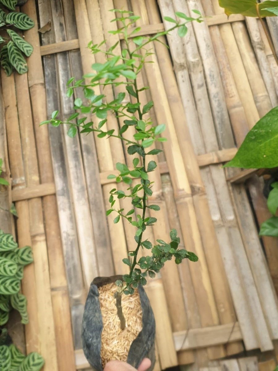 Jeruk Finger Lime ‘Rainforest Pearl’ (Citrus australasica) adalah varietas jeruk unik asal Australia yang dikenal dengan buahnya berbentuk lonjong dan kecil, menyerupai jari. Daging buahnya berupa butiran kecil seperti kaviar dengan rasa asam yang menyegarkan, menjadikannya pilihan ideal untuk menambah cita rasa pada hidangan seafood, minuman, atau hidangan penutup. Tanaman ini dapat ditanam di dalam pot atau di kebun, memerlukan perawatan sederhana dengan sinar matahari cukup dan penyiraman teratur. Finger Lime tidak hanya menghasilkan buah lezat, tetapi juga menambah keindahan taman Anda dengan daun hijau lebat dan bunga harum.